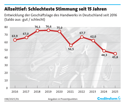 Neuss/Hamburg, 13. März 2025. Die Auswirkungen der zweijährigen Rezession sind im Handwerk deutlich spürbar. Die Stimmung unter den Betrieben ist auf einem Tiefpunkt, wie seit 15 Jahren nicht mehr. Der Geschäftslageindex ist auf 45,8 Punkte gefallen und hat damit den niedrigsten Stand seit 2010 erreicht. Nur 51,6 Prozent der von Creditreform befragten Unternehmen bewerten ihre Geschäftslage als gut oder sehr gut, im Vergleich zu 55,3 Prozent im Vorjahr.