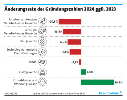 Besonders schwer getroffen ist die Industrie. Im Verarbeitenden Gewerbe wurden 2024 nur noch rund 5.000 Unternehmen gegründet – 38 Prozent weniger als 2016. Im forschungsintensiven Teil der Industrie ging die Zahl der Neugründungen im Jahresvergleich sogar um 20,8 Prozent zurück.
