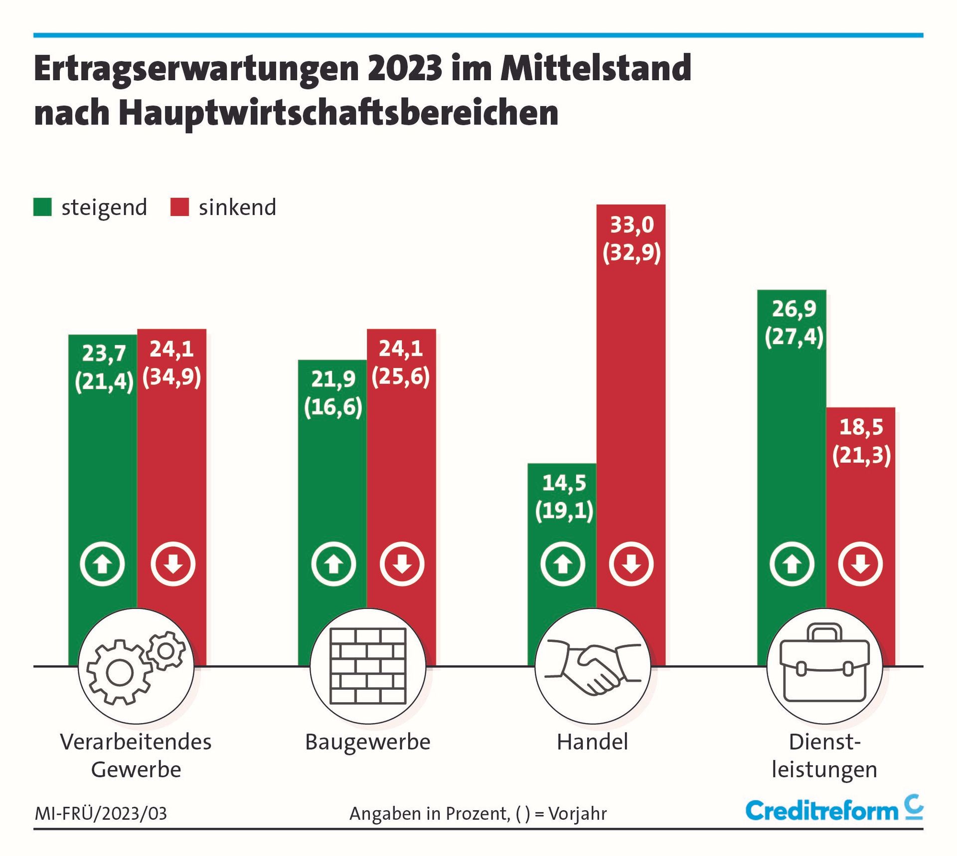 „Das Winterhalbjahr 2022/2023 war für viele mittelständische Unternehmen eine schwierige Zeit. Hohe Energiepreise, steigende Kosten und allgemeine Unsicherheit haben die Unternehmen erheblich belastet“, sagt Patrik-Ludwig Hantzsch, Leiter der Creditreform Wirtschaftsforschung. Gleichzeitig sei der Absatz weggebrochen. So habe sich beispielsweise die Baukonjunktur eingetrübt und vor allem der Handel habe unter einer schlechten Geschäftslage gelitten. Insgesamt hätten die Inflation und deren Folgen die Geschäftsentwicklung im Mittelstand stark gebremst.