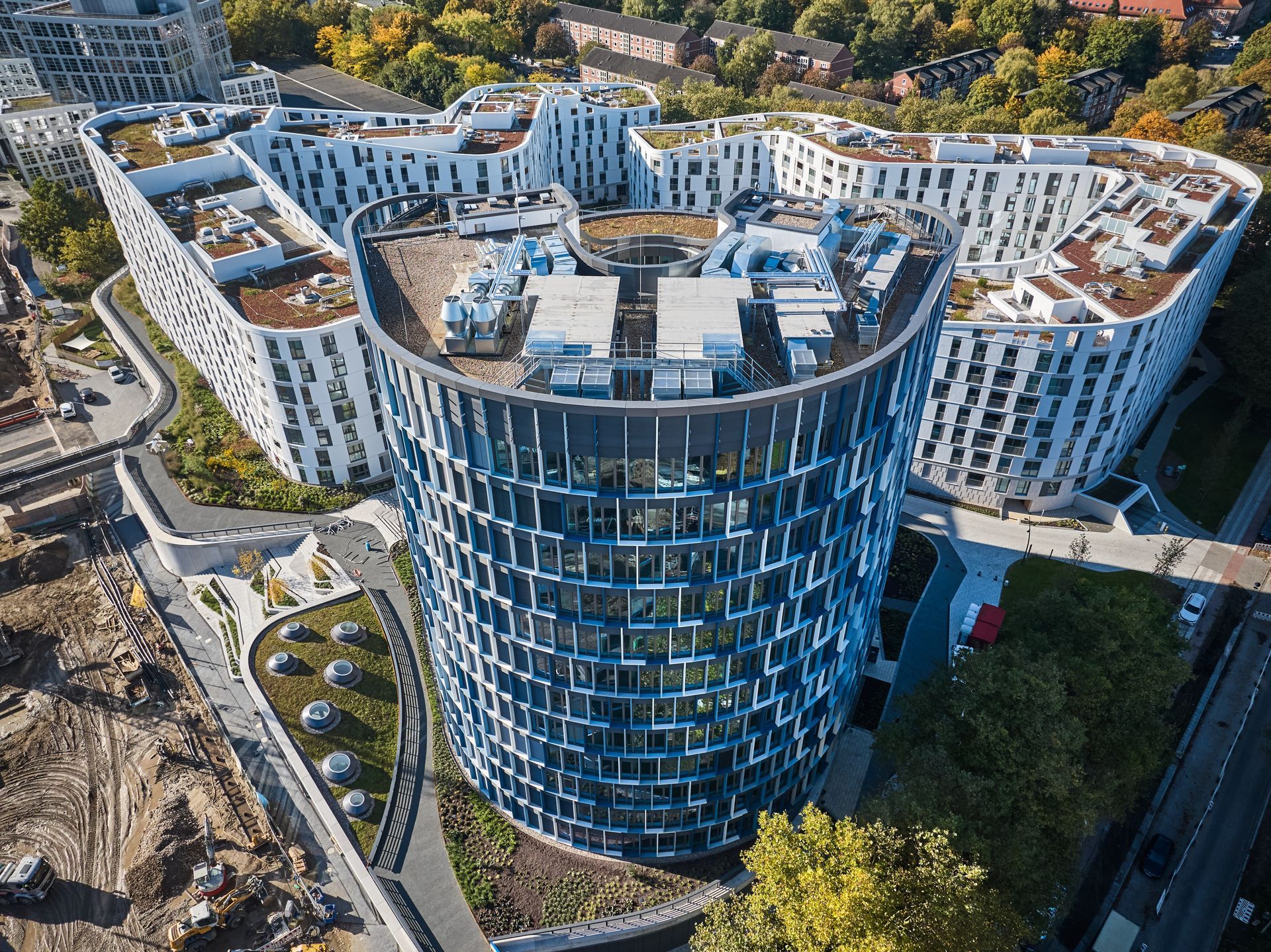 Der neue Büroturm am Überseering ragt 50 Meter in die Höhe und bietet auf 13 Etagen rund 22.000 Quadratmeter Fläche. Neben modernen Arbeitsplätzen entstanden dort auch großzügige Gemeinschaftsbereiche – vom Mitarbeiterrestaurant über Konferenz- und Veranstaltungsräume bis zu begrünten Terrassenmit Blick über die Stadt bis hin zu den Start- und Landebahnen des Hamburger Flughafens.